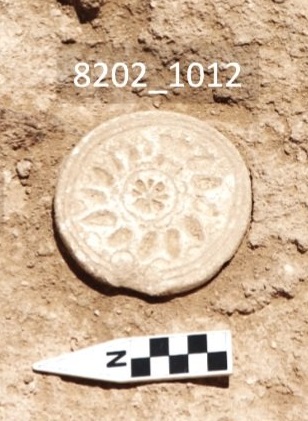 One of my favorite objects to illustrate was a small limestone “bread stamp” with a decorative floral motif carved into its surface, used to make designs on fresh loaves of bread, perhaps for special ritual purposes. Above, at left is the excavation photo showing the original find-spot of the “bread stamp,” before cleaning, while at right is my illustration of the piece. The limestone surface doesn’t show any staining or smoky marks from being in an oven, and archaeologists aren’t quite sure how these stamps were utilized in antiquity.