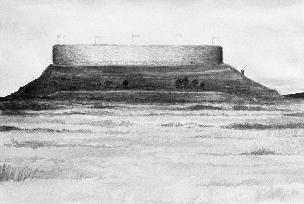Finally, one of the more exciting challenges of the project involved creating reconstruction drawings of the site’s Hellenistic fortifications. After visiting the dig site, where the directors highlighted certain topographical features, I used pen, brush, and India ink to create renderings of the site as it might have looked around 300 BCE, with mudbrick walls atop fieldstone foundations.