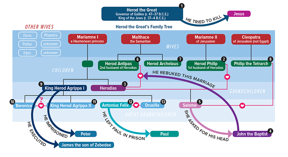 The Herodian family tree and key events in the New Testament related to members of the Herodian family. Click to enlarge. Credit: Biblical Archaeology Society.