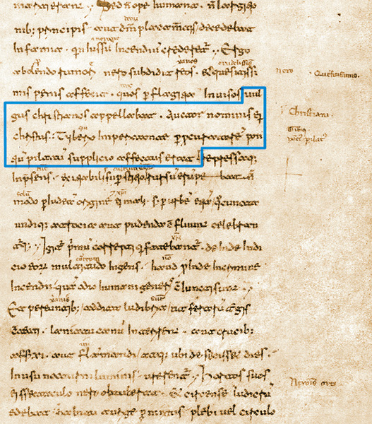 [T]he original hand of the oldest surviving manuscript, the Second Medicean (eleventh century), which is almost certainly the source of all other surviving manuscripts, reads Chrestianoi, “Chrestians.” A marginal gloss “corrects” it to Christianoi. Chrestianoi is to be preferred as the earliest and most difficult reading and is adopted by the three current critical editions and the recent scholarship utilizing them. It also makes better sense in context. Tacitus is correcting, in a way typical of his style of economy, the misunderstanding of the “crowd” (vulgus) by stating that the founder of this name (auctor nominis eius) is Christus, not the name implicitly given by the crowd, Chrestus. Tacitus could have written auctor superstitionis, “the founder of this superstition,” or something similar, but he calls attention by his somewhat unusual phrase to the nomen [name] of the movement in order to link it directly—and correctly—to the name of Christ (Van Voorst, Jesus Outside, pp. 43–44. See also John P. Meier, A Marginal Jew: Rethinking the Historical Jesus, vol. 1: The Roots of the Problem and the Person, Anchor Bible Reference Library [New York: Doubleday, 1991], p. 100, note 7.).