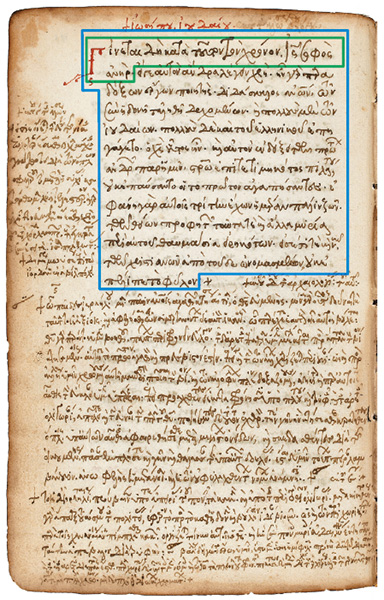 THE TESTIMONY OF JOSEPHUS. This 15th-century manuscript, now in the Bibliothèque Nationale de France, contains the portion of Josephus’s Testimonium Flavianum that refers to Jesus (highlighted in blue). The first sentence of the manuscript, highlighted in green, reads, from the Greek, “Around this time there lived Jesus, a wise man, if indeed one ought to call him a man.” The majority of scholars believe this passage of the Testimonium is based on the original writings of Josephus but contains later additions, likely made by Christian scribes. Photo: Codex Parisinus gr. 2075, 45v. Courtesy Bibliothèque Nationale de France.