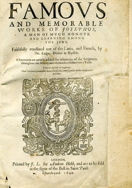 JAMES, BROTHER OF JESUS. In Jewish Antiquities, parts of which are included in this mid-17th-century book of translations, Josephus refers to a James, who is described as “the brother of Jesus-who-is-called-Messiah.” Josephus’s mention of Jesus to specify which James was being executed by the high priest Ananus in 62 C.E. affirms the existence of the historical Jesus. Photo: Josephus, Famovs and Memorable Works of Josephvs, trans. by Thomas Lodge (London: J. L. for Andrew Hebb, 1640).